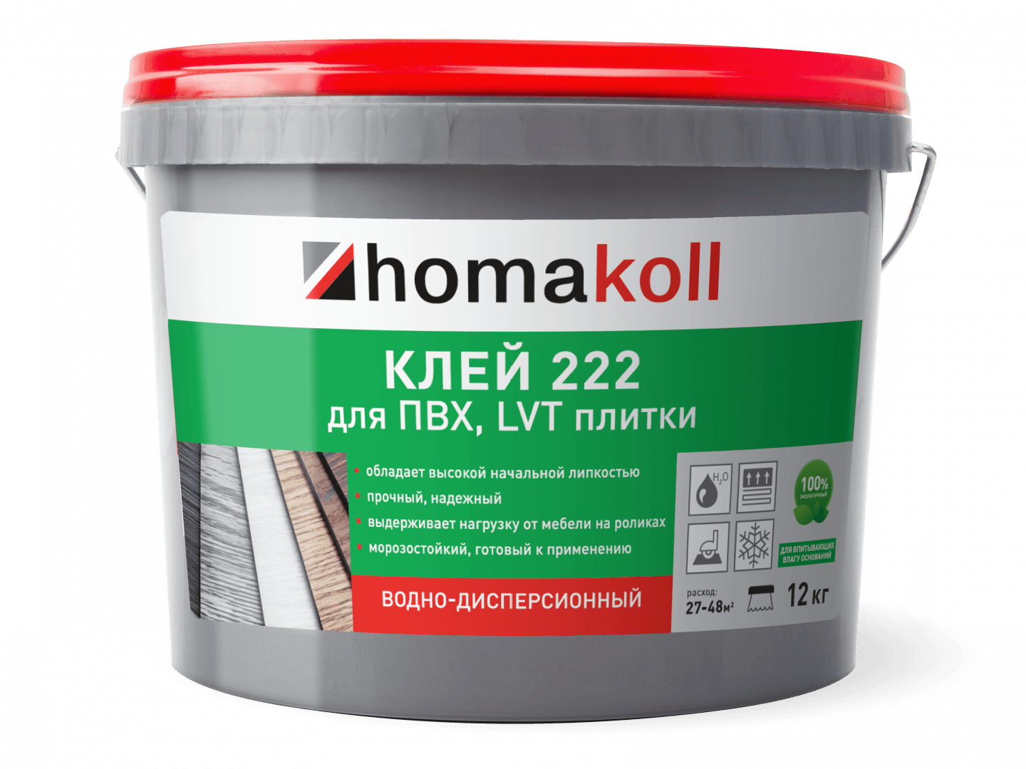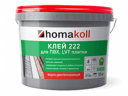 Клей Homakoll 222 – готовый клей для впитывающих воду оснований. Предназначен для приклеивания напольных модульных ПВХ и LVT покрытий, а также рулонных напольных покрытий на разных подосновах: вспененной, джутовой, войлочной и тканой подоснове.